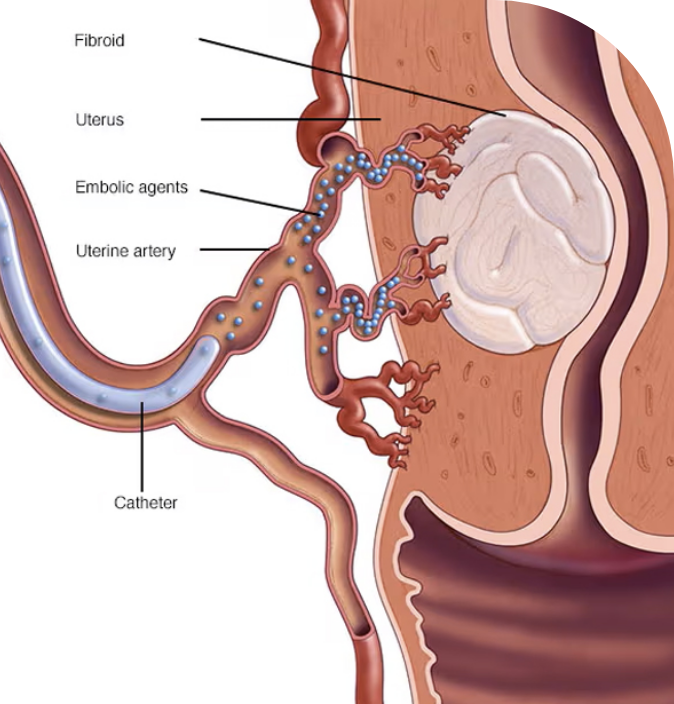 باستخدام توجيه الأشعة السينية ، يتم وضع أنبوب صغير أو قسطرة في الشريان الذي يغذي الورم الليفي من خلال شق صغير يتم إجراؤه في الفخذ أو الساعد. يتم بعد ذلك حقن جزيئات صغيرة في الشريان لمنع تدفق الدم إلى الأورام الليفية مما يؤدي إلى تقلص الورم الليفي ويقلل من النزيف غير الطبيعي لأنه لن يتلقى الأكسجين أو المغذيات